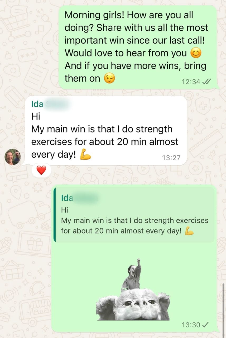 The private WhatsApp group is where this connection comes alive. It’s not just casual conversation, it’s daily check-ins, real support, questions, encouragement, and practical advice. You’ll share your wins, your challenges, your updates, and receive real-time feedback, personalised adjustments, and the kind of daily accountability that keeps you steady even on the tough days.